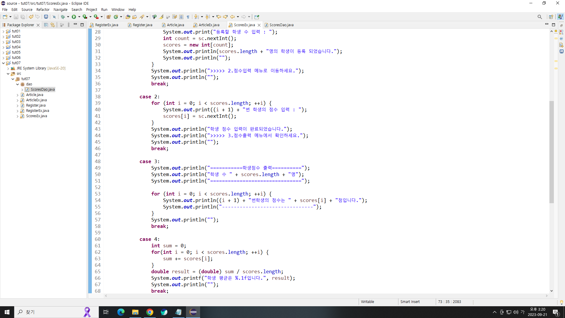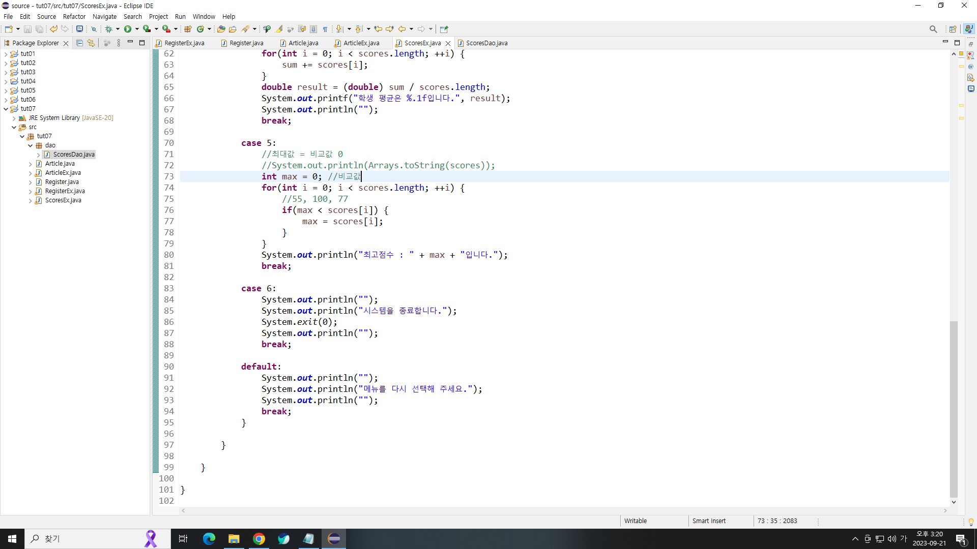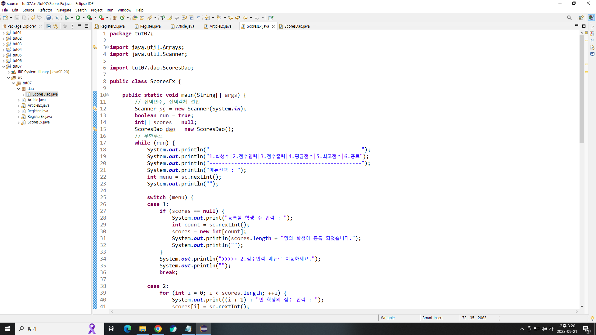 1. 학생수 | 2. 점수입력 | 3. 점수출력 | 4. 평균 | 5. 최고점수 | 6. 종료