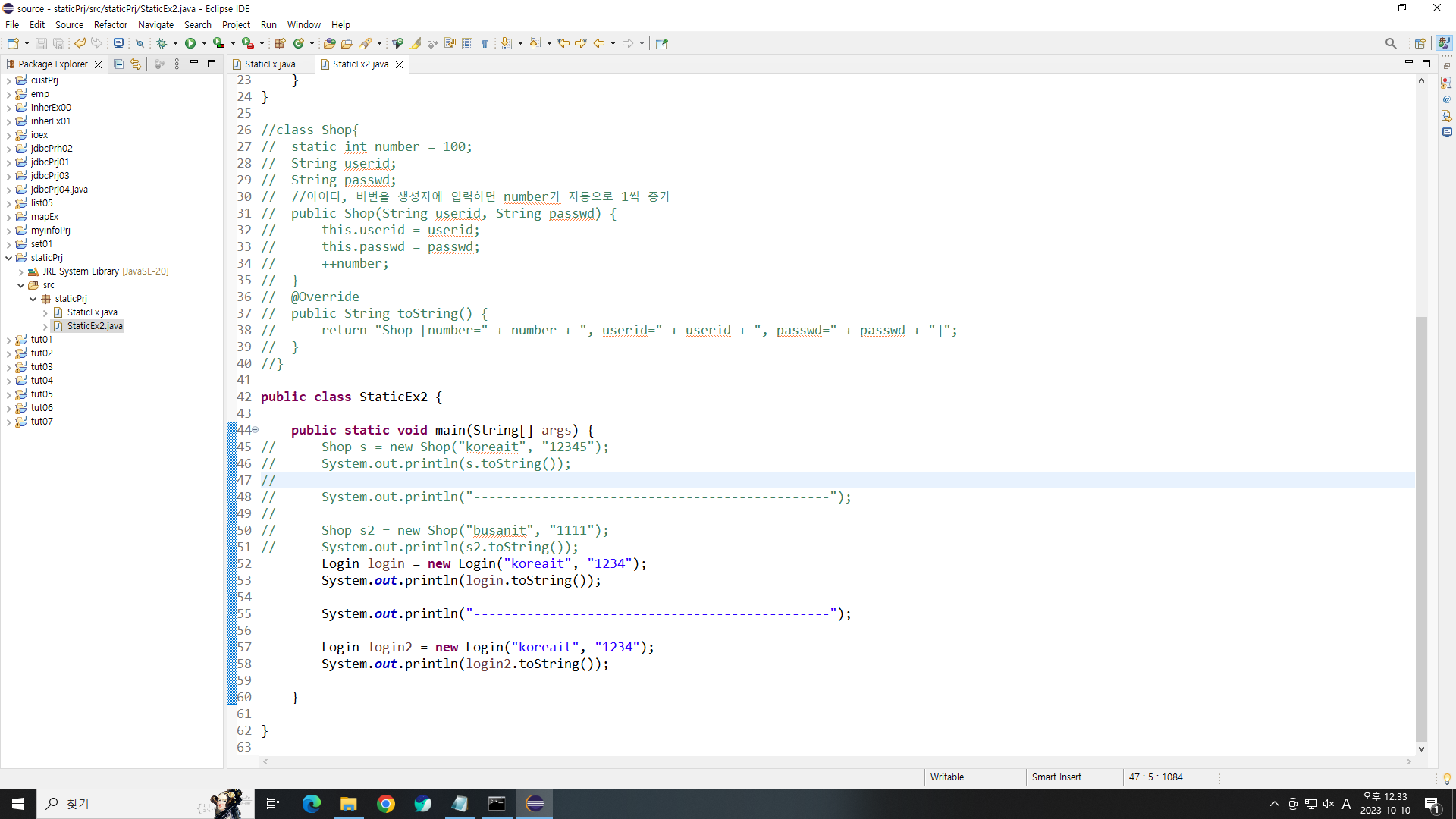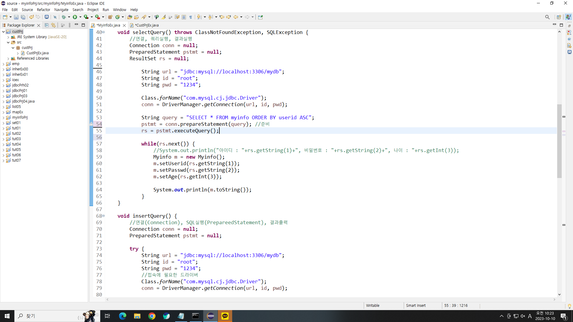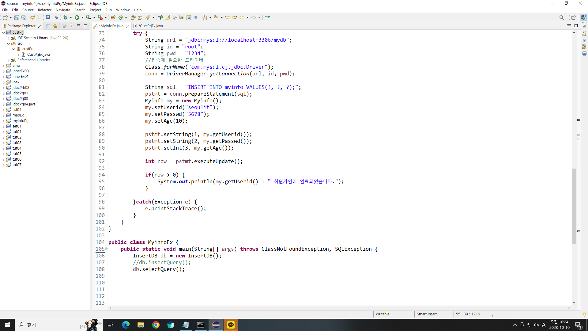 MyinfoEx.java(메인클래스) : 이전과는 다르게 객체파일을 분리하지 않고 한번에 진행