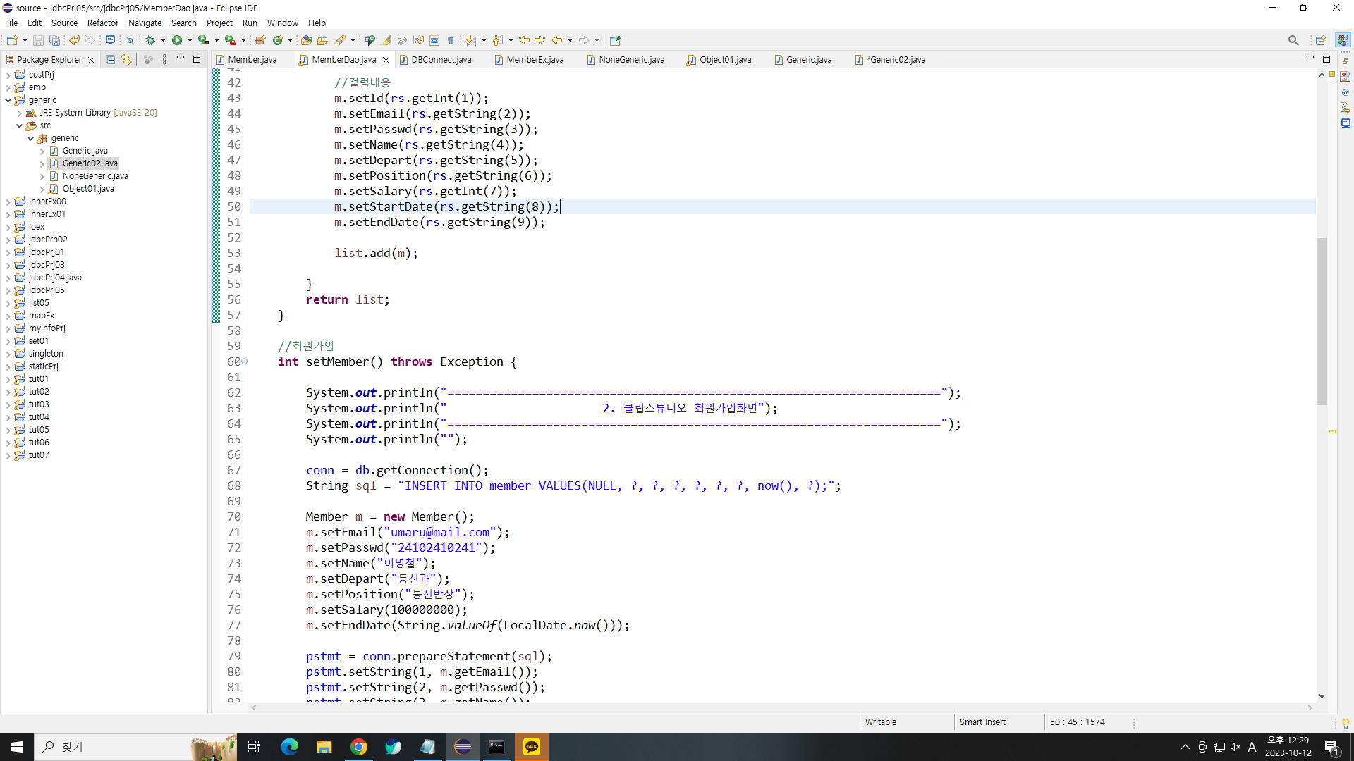 - MemberDao.java(메소드) : Scanner, Connection, PrepareStatement, ResultSet, DBConnect를 이용해서 회원가입 프로그램 작성(회원목록, 회원가입, 회원수정, 회원삭제, 회원검색, 종료)