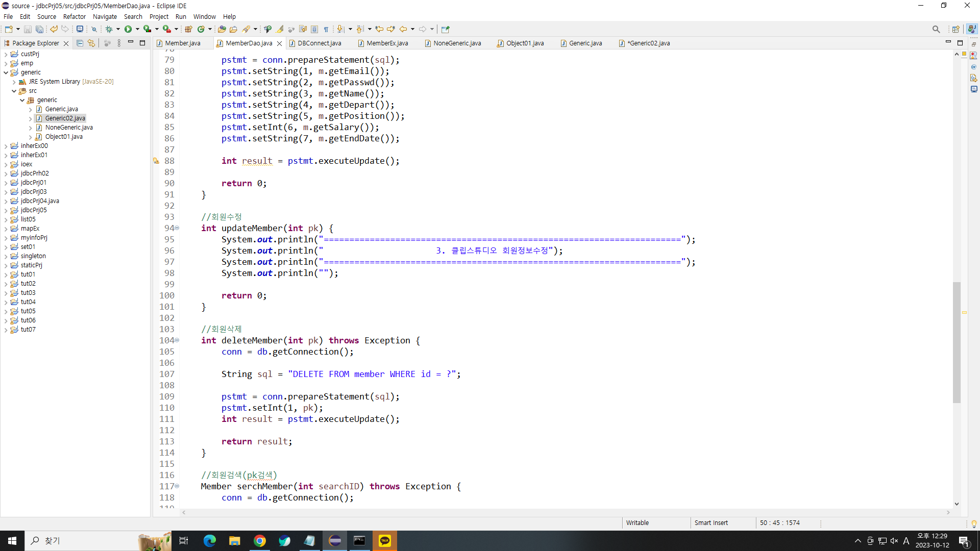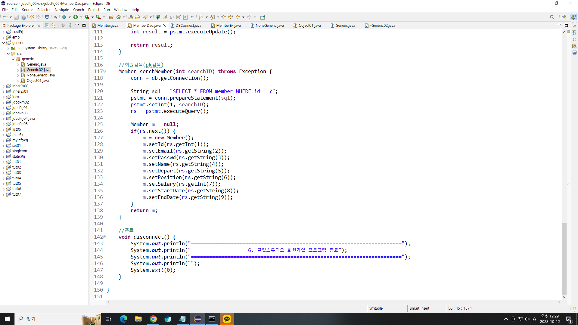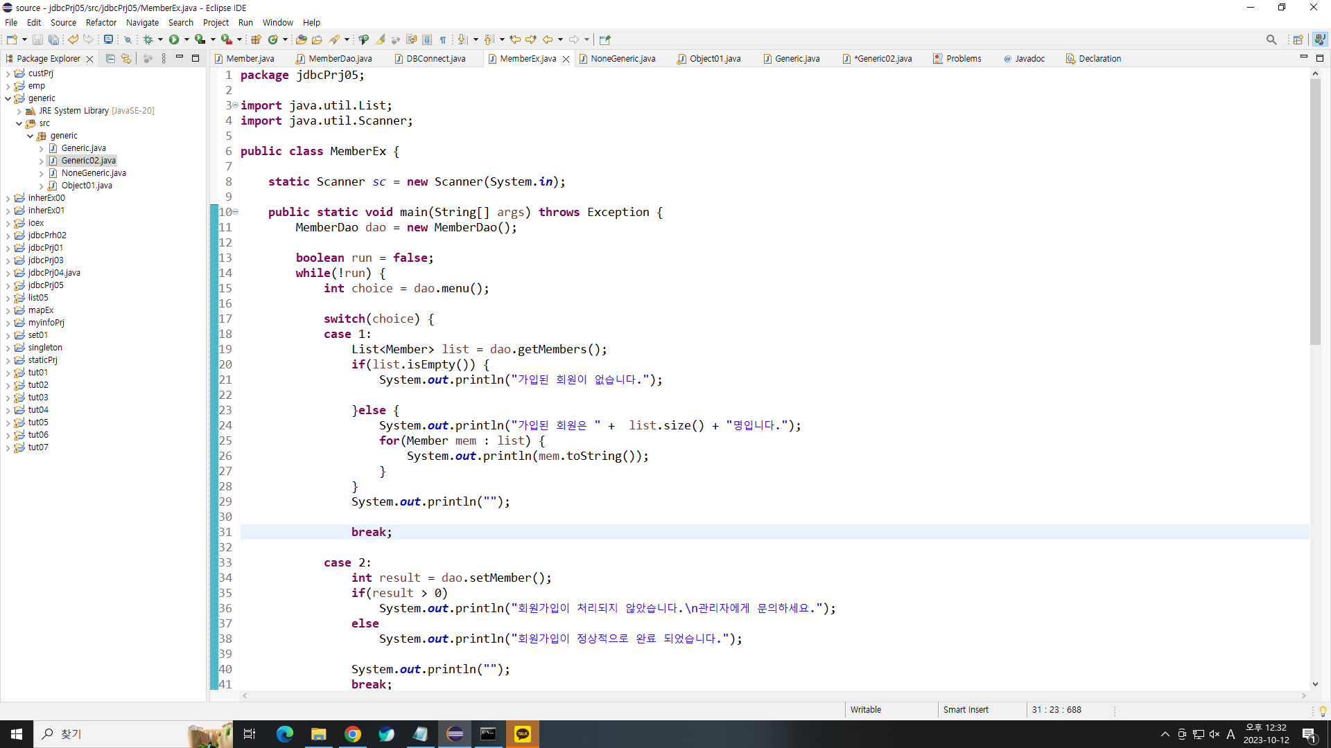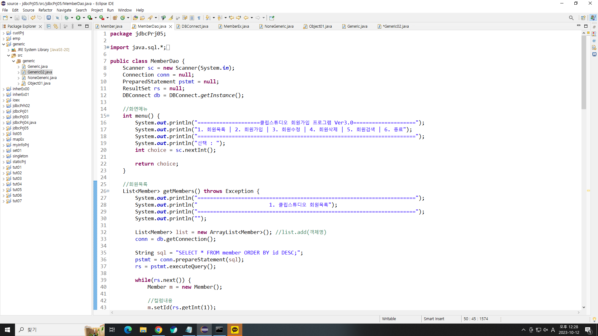 - MemberEx.java(출력) : while, switch, if, for등 배웠던 거의 모든 구문 활용해서 출력