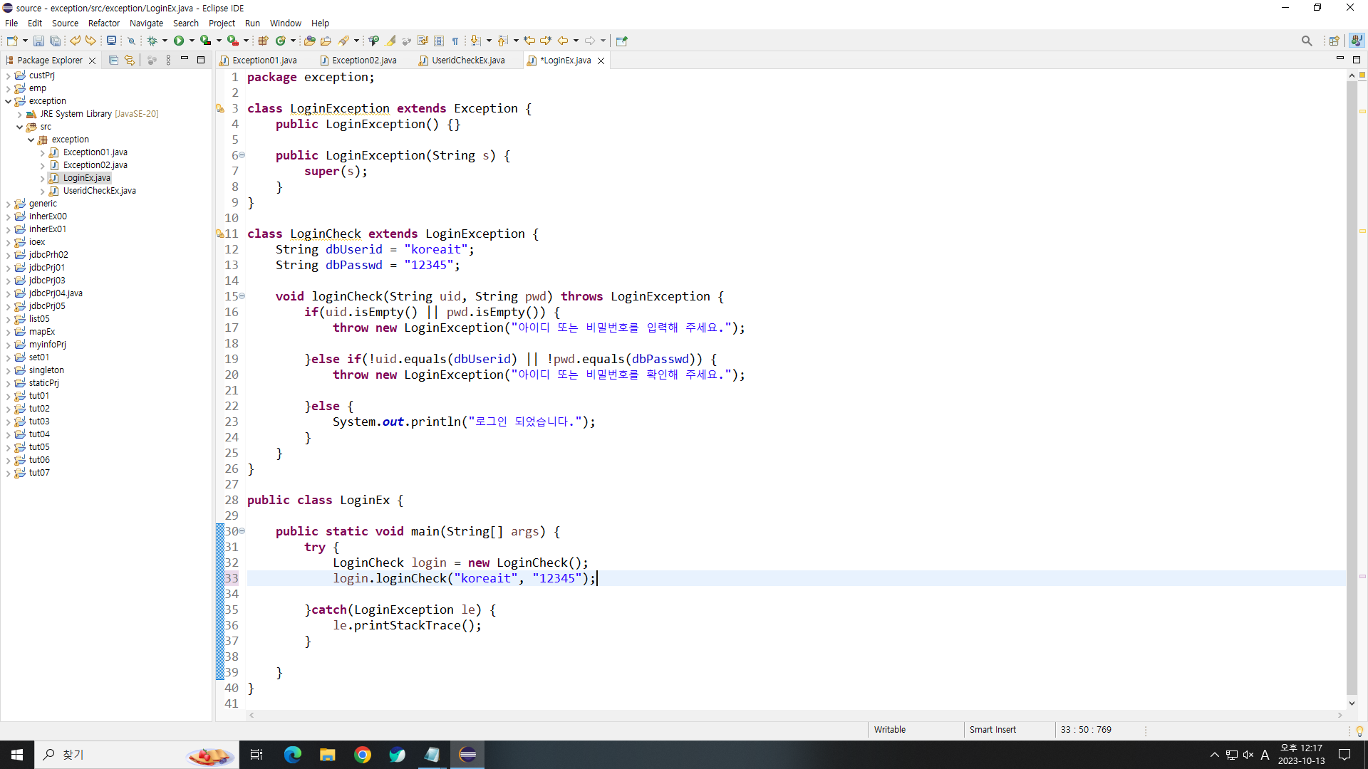 마지막으로 메인메소드에서 try ~catch문을 사용해서 아이디랑 비밀번호를 넣어보면서 확인한다.