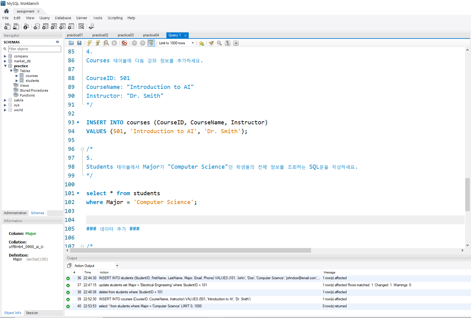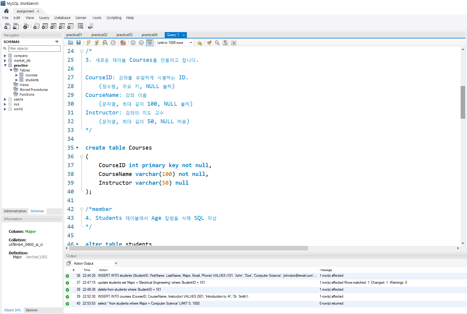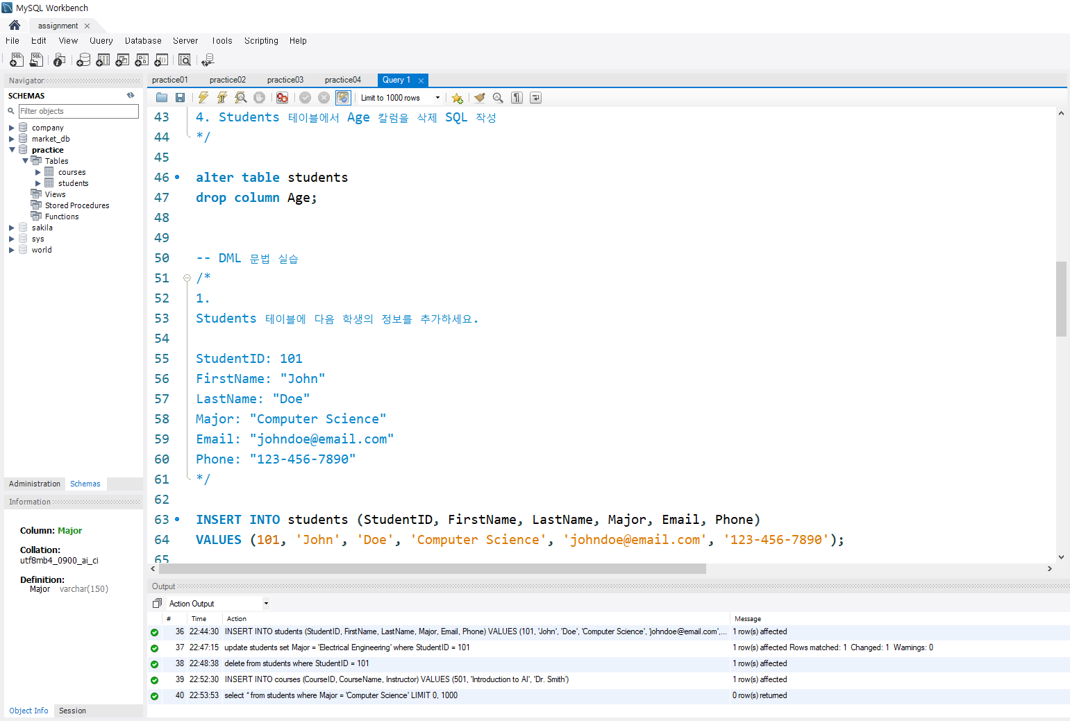목적 : 칼럼의 추가, 데이터 타입 변경, 새로운 테이블 생성, 칼럼삭제, 등등 지난 강의시간동안