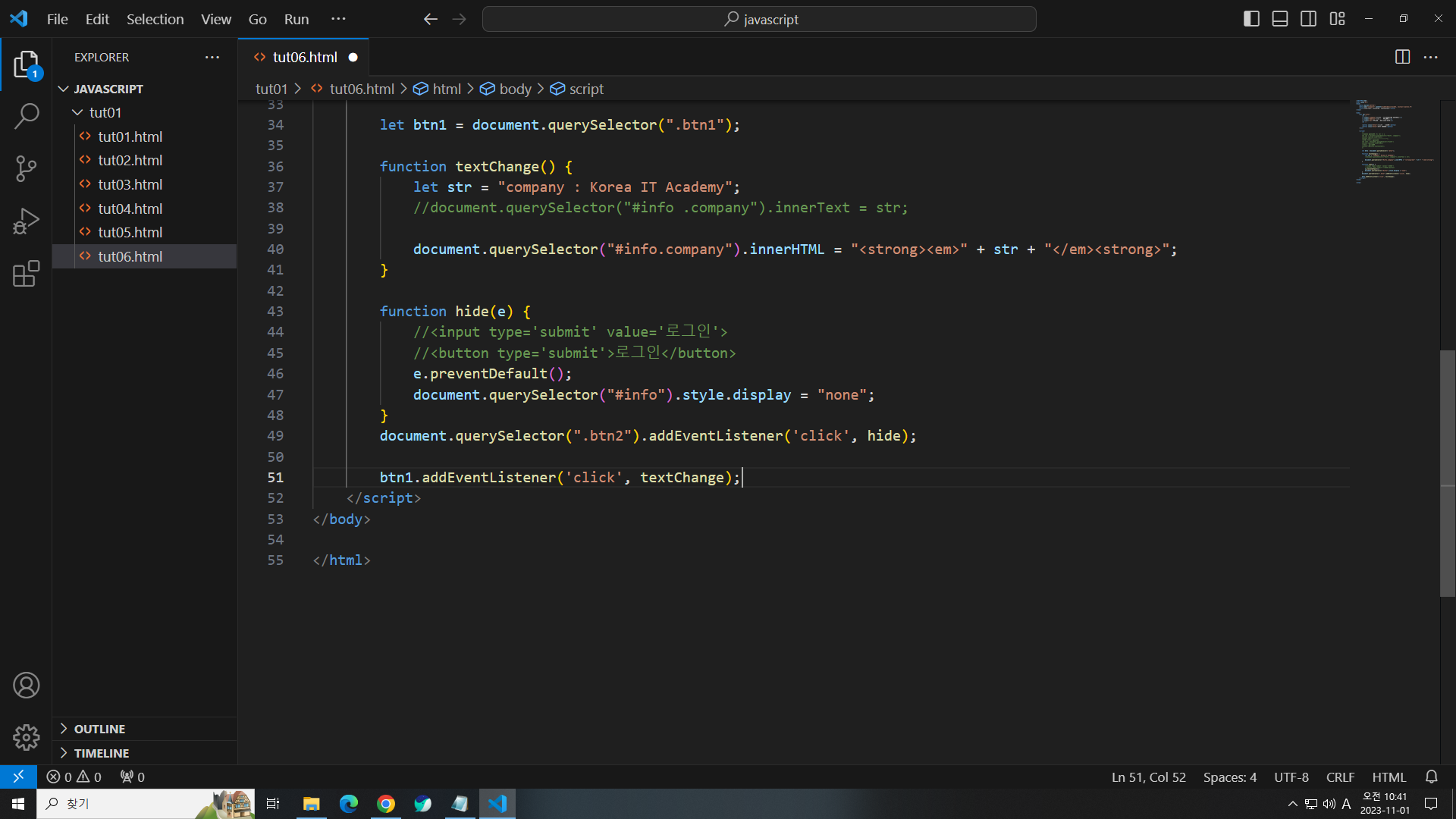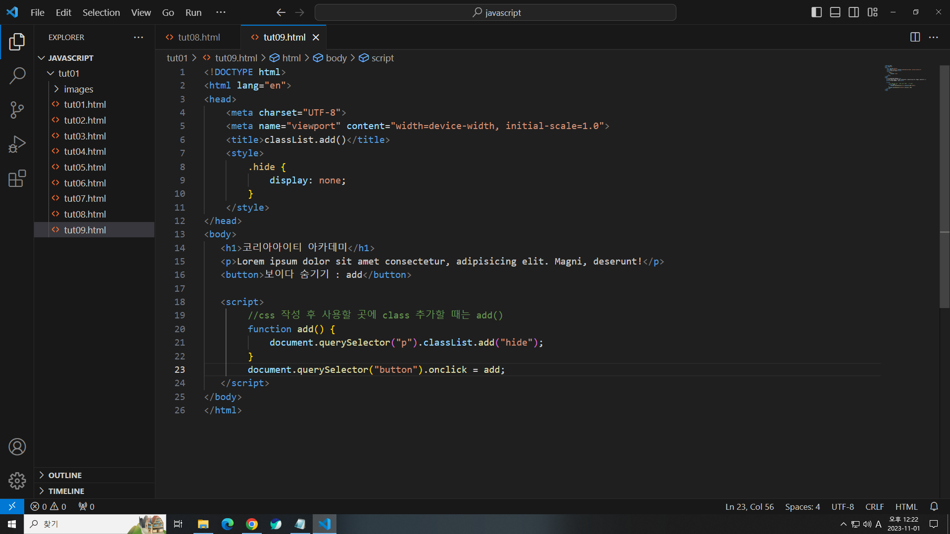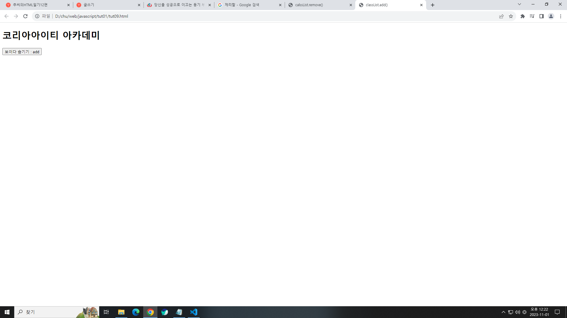 JAVASCRIPT>tut09.html : classList.add : 지정한 곳에 클래스 이름 만드는 명령어(보이기)