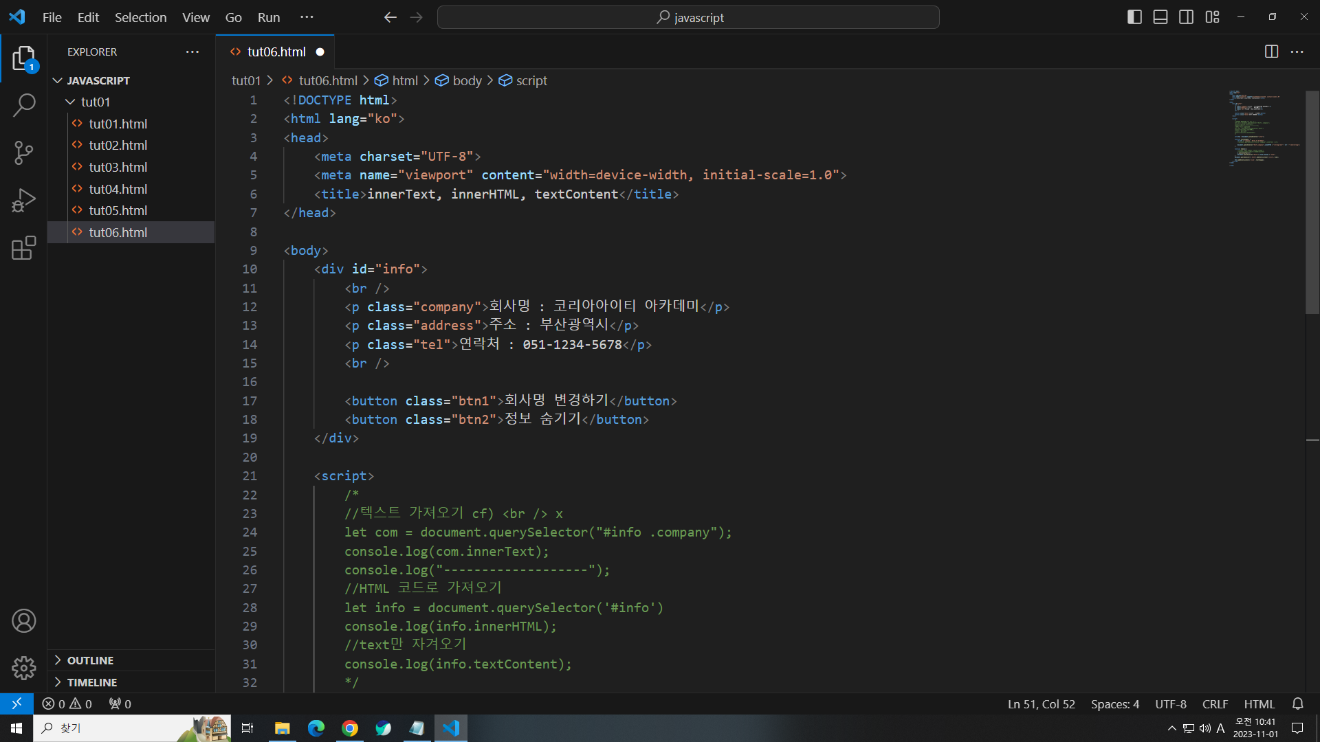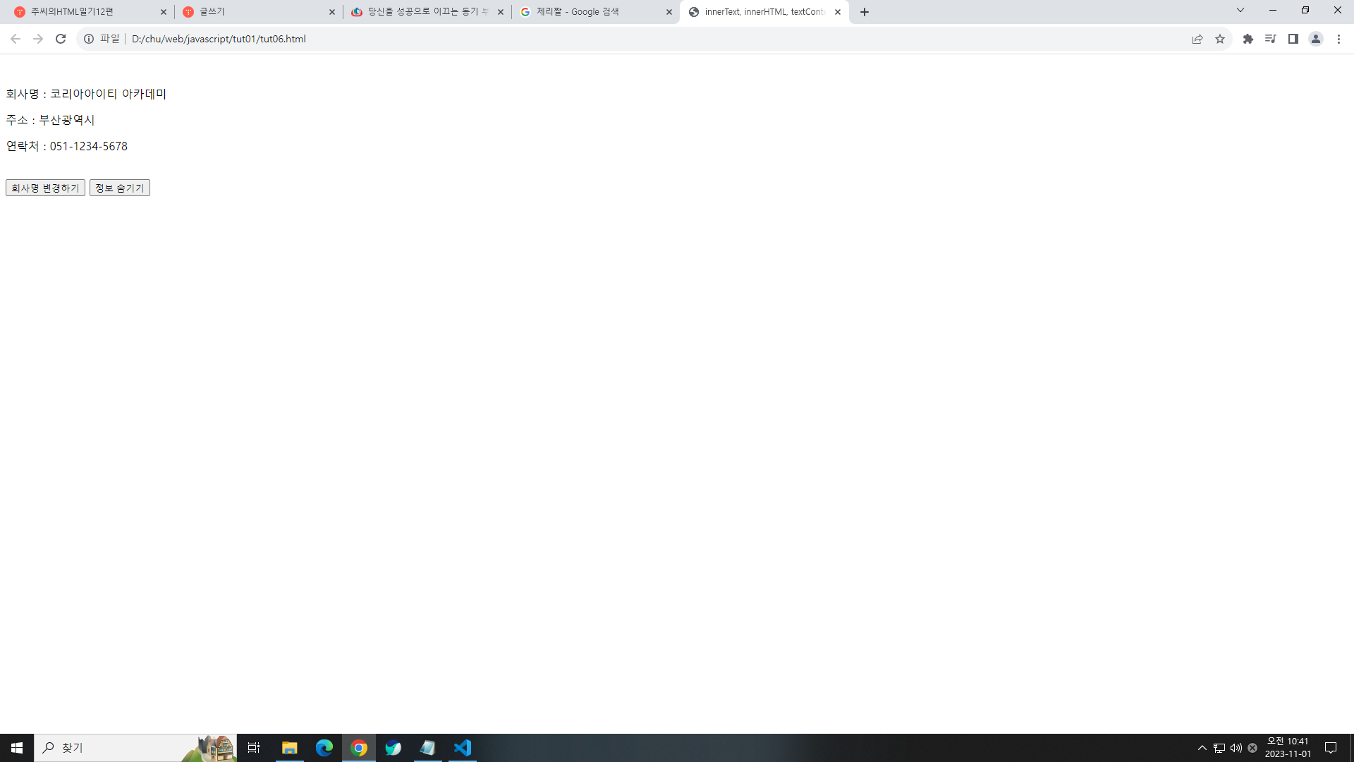 JAVASCRIPT>tut06.html : 텍스트가져오기(innerText, innerHTML, textcontent)
