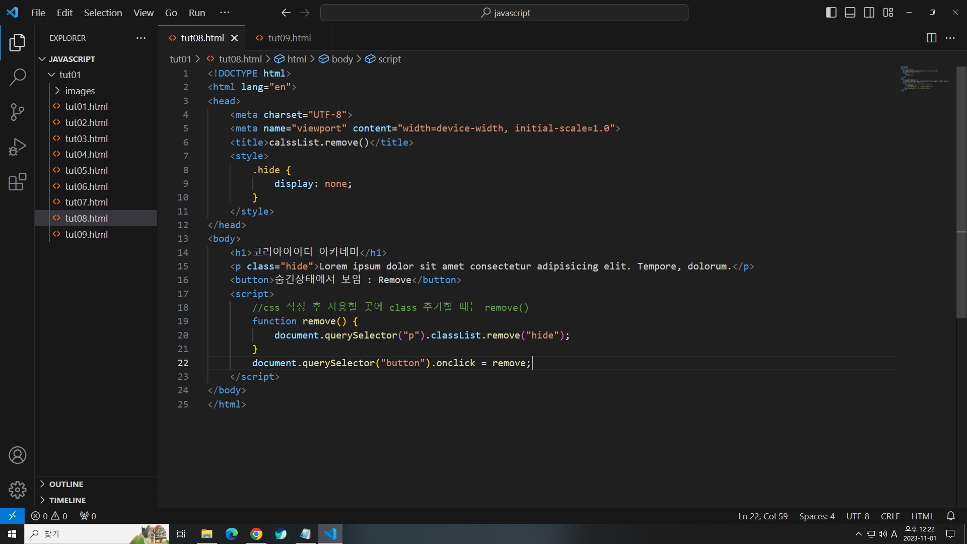 JAVASCRIPT>tut08.html : classList.remove : 지정한 곳에 클래스 이름 지우는 명령어(숨기기)