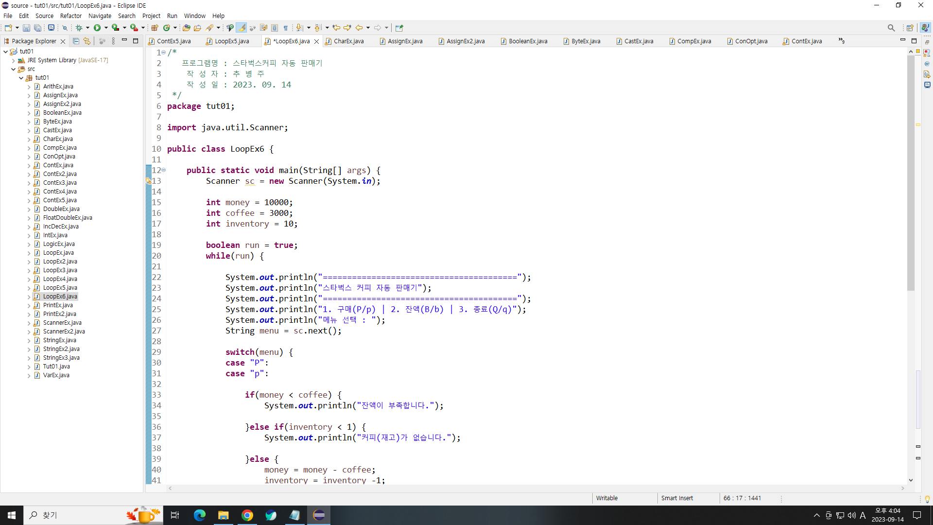느낀점 : 마지막 예제 카페프로그램에서 구매랑 잔액확인까지는 된거 같은데 마무리나 디테일이 좀 안잡힌듯