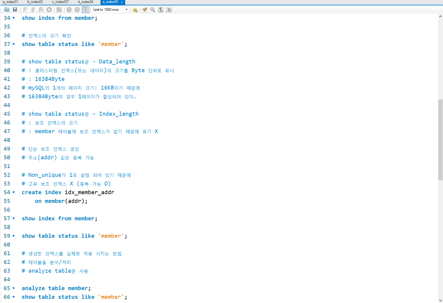 e_index05.sql : 인덱스의 생성과 제거, 설정 및 크기 확인과 인덱스 적용