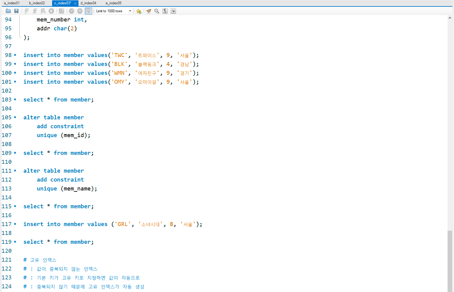 c_index03.sql : 고유키와 고유인덱스 + 테이블 인덱스 확인