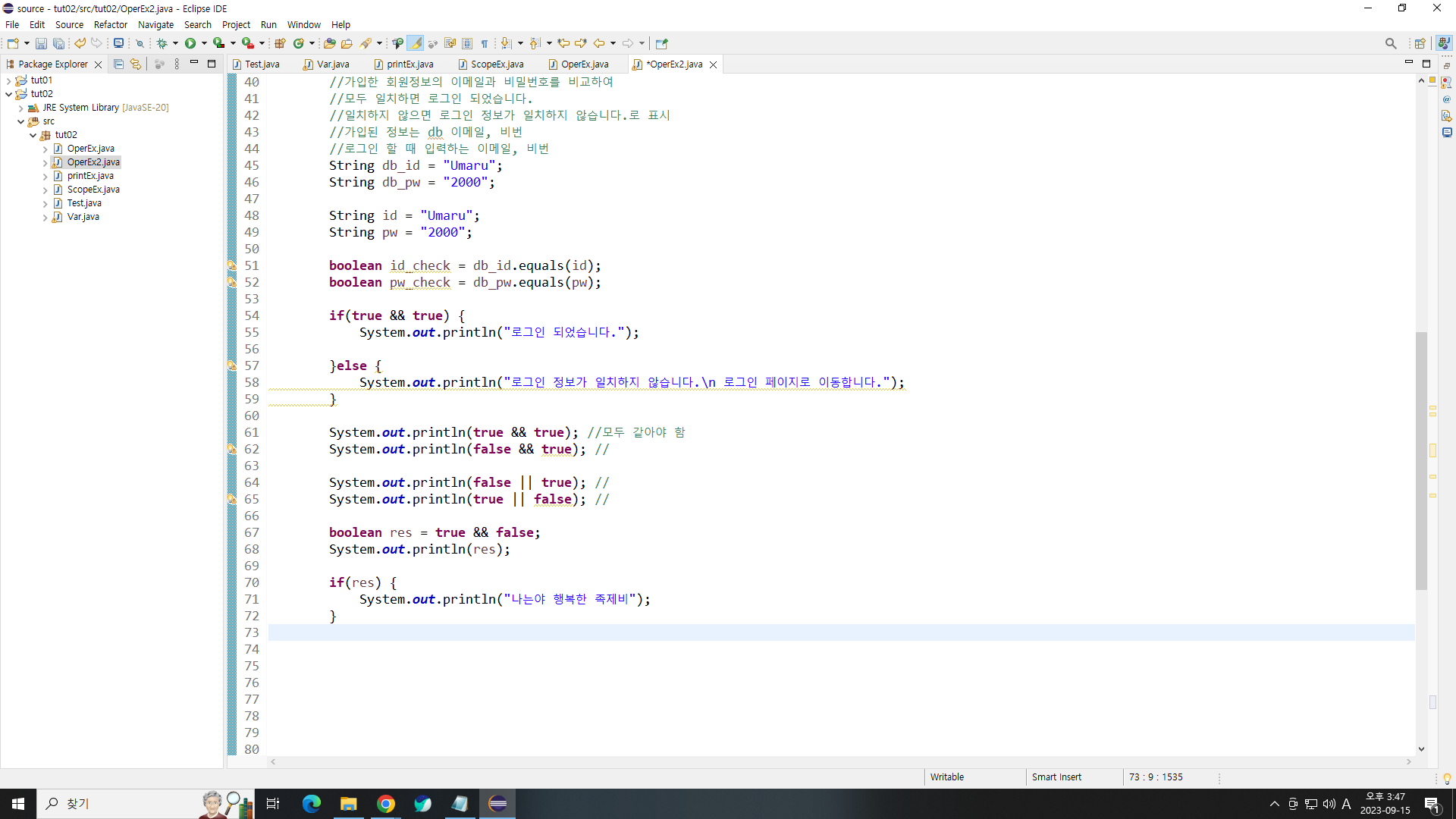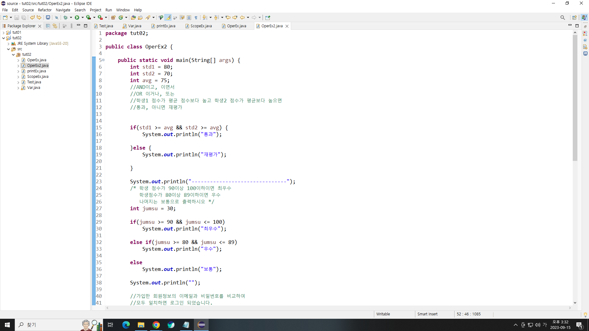 AND 연산(조건1 && 조건2) : 조건 모두 만족해야 참