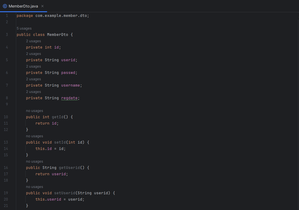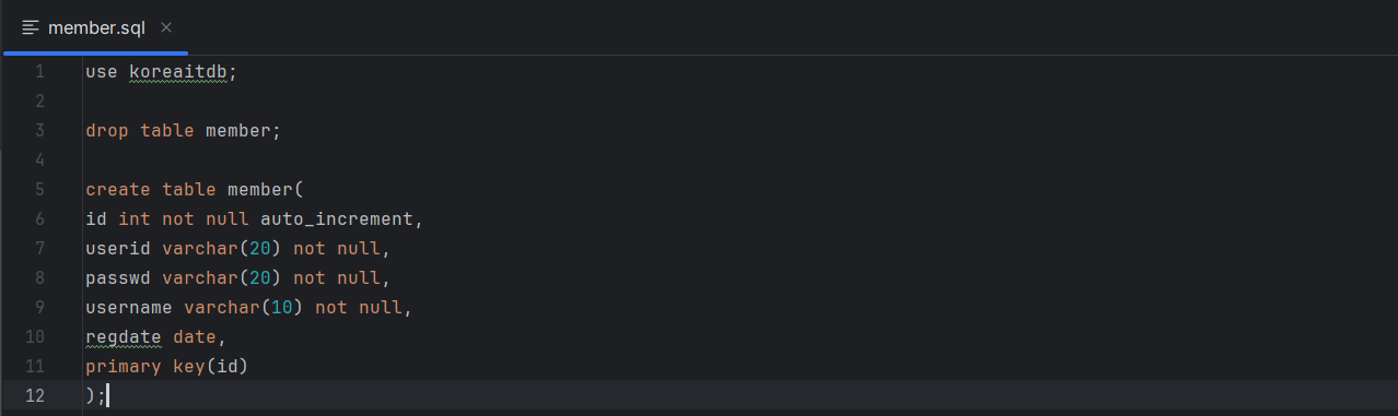 [DataBase생성] : static안에 sql디렉터리 안 member.sql 생성