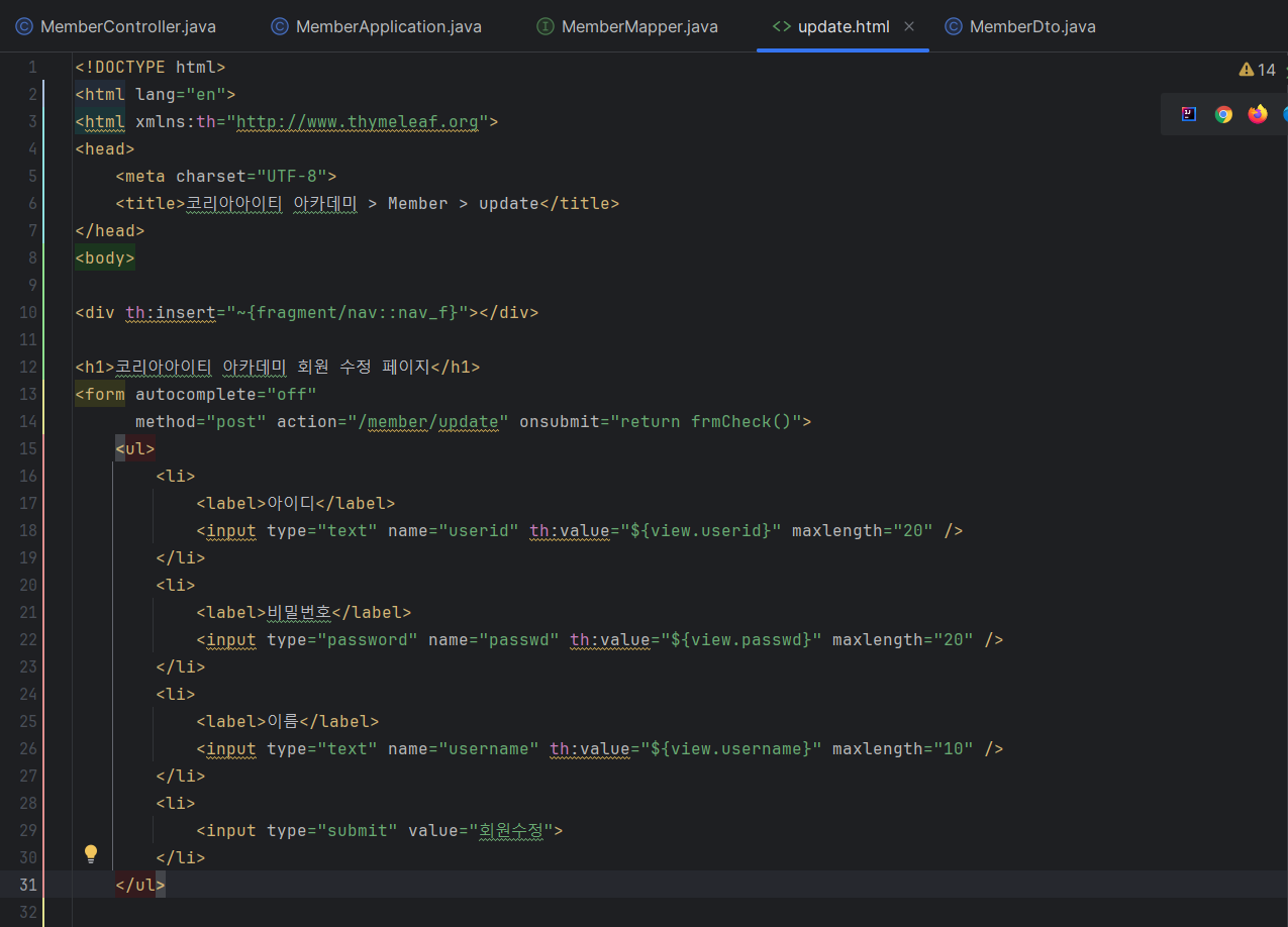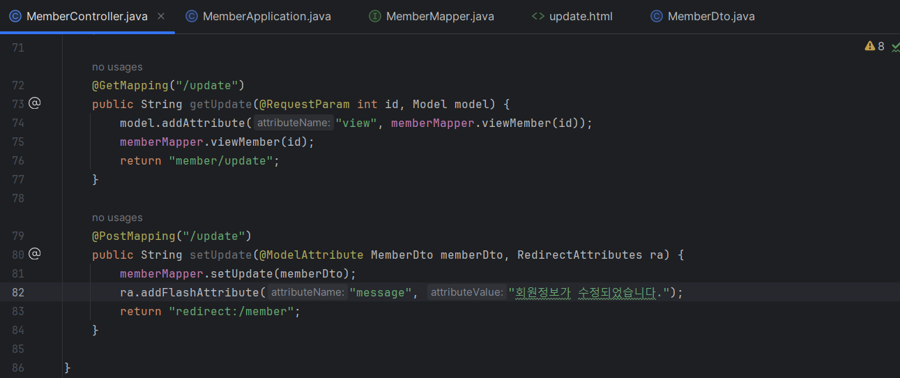 [MemberController.java] : Getmapping + PostMapping에 각각 getUpdate + setUpdate 추가