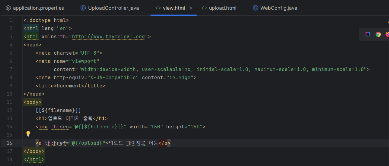 타임리프문법을 사용해서 업로드 이미지 출력을 하고 파일업로드를 내 폴더에서 사이트에 올리는걸 보여주는 html