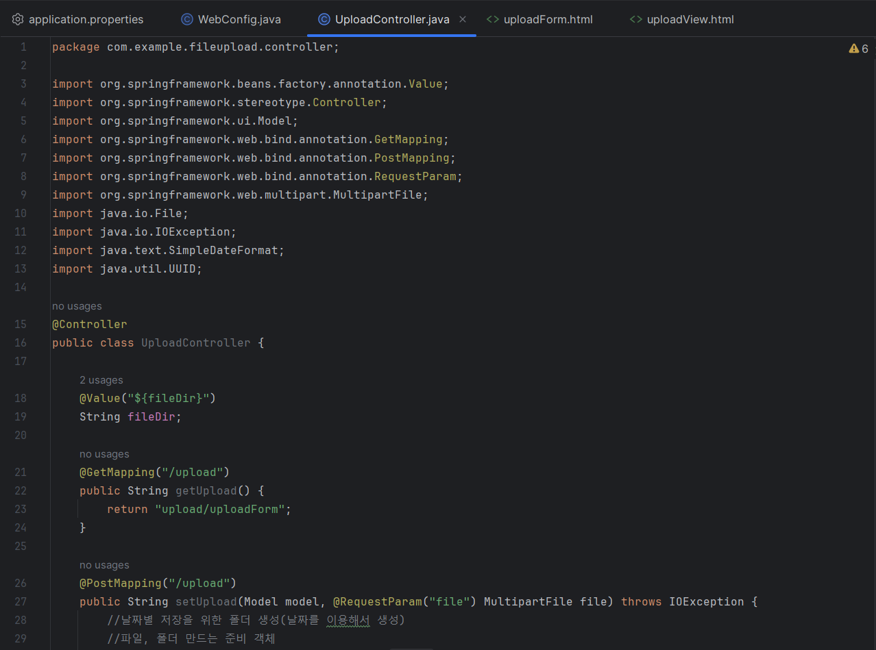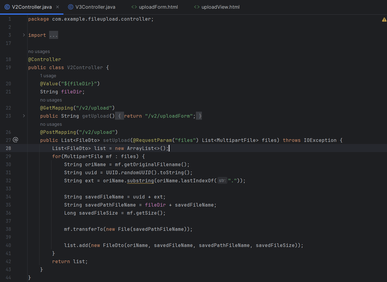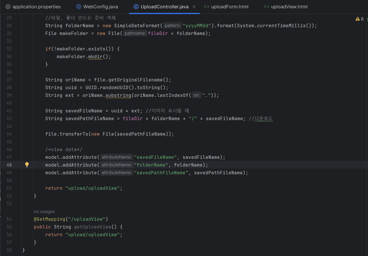 [UploadController.java] : 언제나 그렇듯 메인 동작은 여기서 + 파일저장경로 + 파일이름 + 확장자명 변수처리